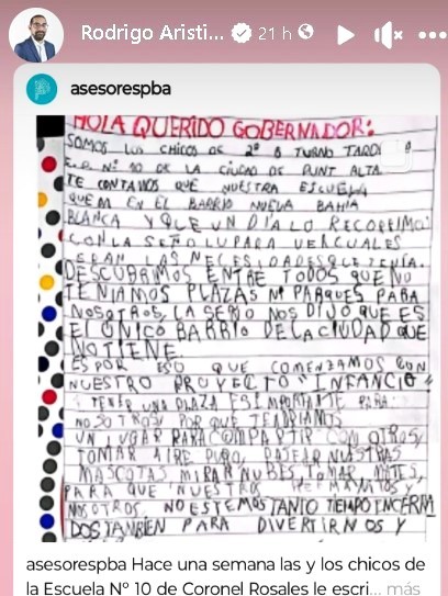 Hace unos días las y los chicos de 2°B de la Escuela N° 10 le escribieron una carta a @kicillofok porque querían una plaza para su barrio (Nueva Bahía Blanca)