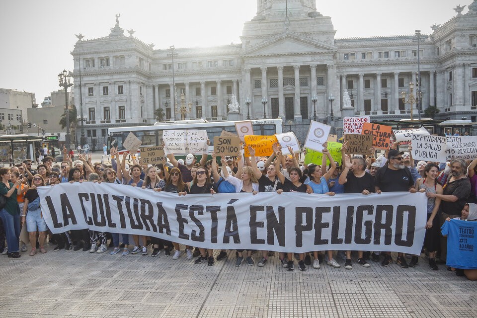 “Subite al colectivo anti ómnibus”. Esa fue la consigna con la que diversos sectores del ámbito de la cultura convocaron a una intervención artística participativa y abierta frente al Congreso de la Nación, en repudio el proyecto de ley impulsado por el gobierno nacional que –entre otros puntos de conflicto con la derogación de leyes vigentes– pretende cerrar reconocidas instituciones como el Fondo Nacional de las Artes (FNA) y el Instituto Nacional del Teatro (INT), además de desfinanciar el Instituto Nacional de Cine y Artes Audiovisuales (Incaa), el Instituto Nacional de la Música (Inamu) y la Comisión Nacional de Bibliotecas Populares (Conabip), y derogar la Ley 25.542 que garantiza un precio único en la venta de libros.
