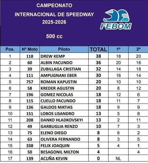 Encabeza la tabla de posiciones el británico Drew Kemp (ganador de la última cita disputada en Daireaux) con 38 puntos, escoltado por Facundo Albín (se llevó la final de la primera cita) con 36, tercero aparece Cristian Zubillaga con 32, mientras que cuarto está Eber Ampugnani con 30 unidades.