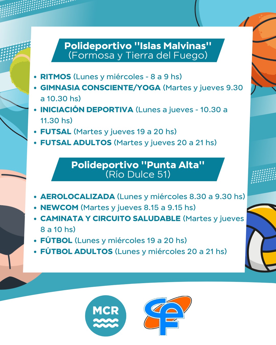 La Dirección de Deportes del Municipio de Coronel Rosales, en articulación con el Centro de Educación Física N° 72, lanzó una propuesta de actividades deportivas gratuitas para este verano. Las actividades, que se llevarán a cabo durante los meses de enero y febrero, estarán disponibles de lunes a jueves en los Polideportivos Municipales, con el objetivo de fomentar la actividad física, los hábitos saludables y el aprovechamiento de los espacios deportivos municipales durante la temporada estival.