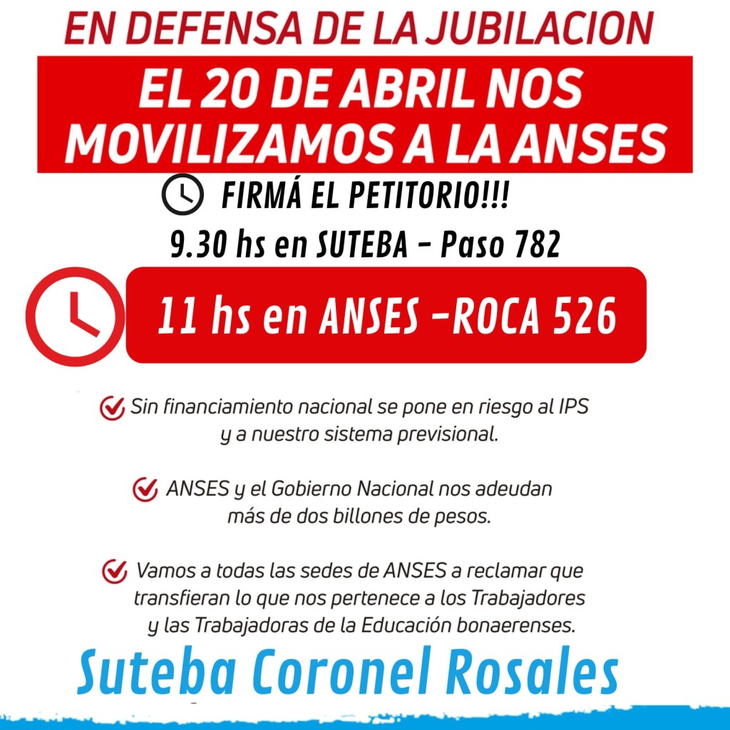 En el marco de una jornada de protesta, desde Suteba Coronel Rosales informaron que el lunes 20 de abril se movilizarán hacia las oficinas de ANSES para presentar un petitorio y una nota formal. La acción busca manifestar el rechazo a las maniobras de desfinanciamiento que, según señalan, afectan tanto al sistema previsional nacional como a los regímenes provinciales.
