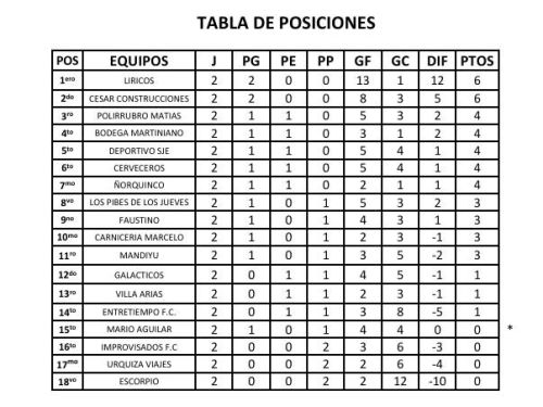 Con 4 puntos aparecen Polirrubro Matías, Bodega Martiniano, Deportivo SJE, Cerveceros y Noruquinco, manteniéndose al acecho. Más atrás, con 3 unidades, se ubican Los Pibes de los Jueves, Faustino, Carnicería Marcelo y Mandiyú.