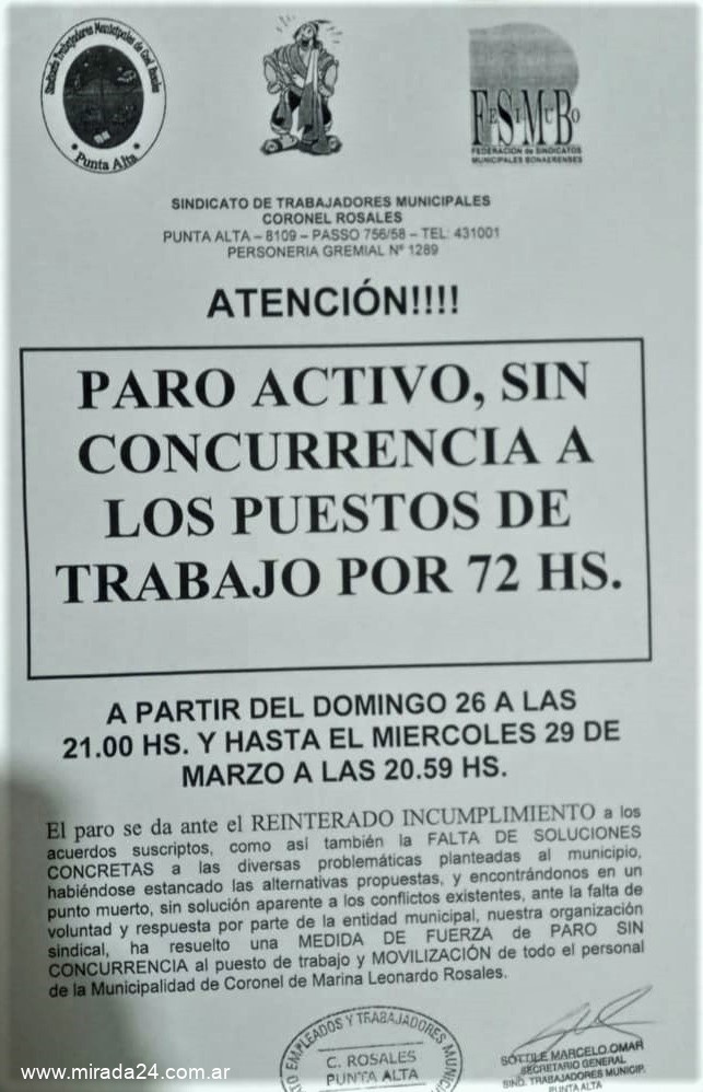Nueva medida de fuerza del sindicato de trabajadores municipales-paro por 72 hs