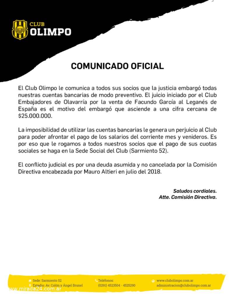 El Club Olimpo informó esta noche que la Justicia embargó todas las cuentas bancarias de la institución de manera preventiva, debido al juicio iniciado por el Club Embajadores de Olavarría, por la venta del futbolista Facundo García al Leganés de España.