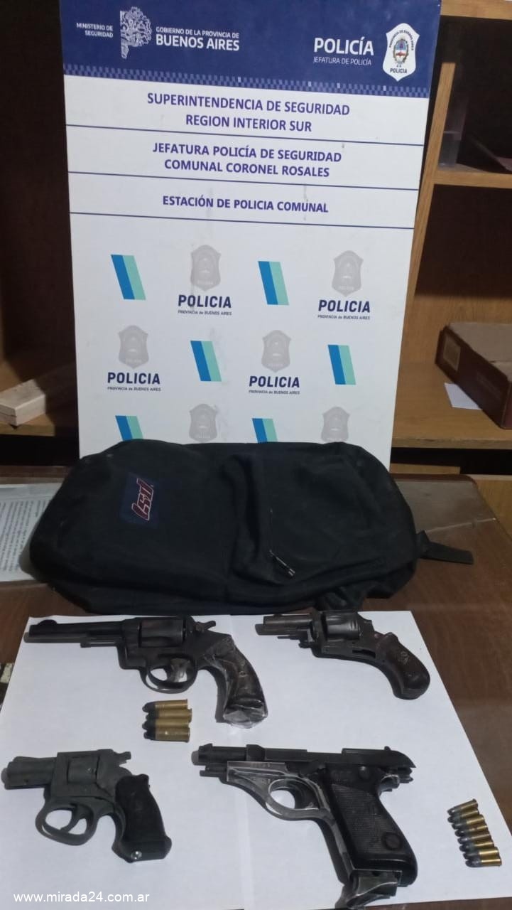 Observándose que sujetos poseen frondosos antecedentes penales y los mismos quisieron evitar el control policial, intentando ocultar algún objeto en el interior del rodado en cuestión, se constata en habitáculo mochila conteniendo Pistola Beretta, cal .22 con 8 municiones y revolver calibre 38 con 4 municiones, en requisa personal de ASTIASARAN CARLOS portaba entre sus prendas revolver marca Italo Gra, cal .22 y revolver marca British Bull Dog, cal . 32 ambos sin munición.