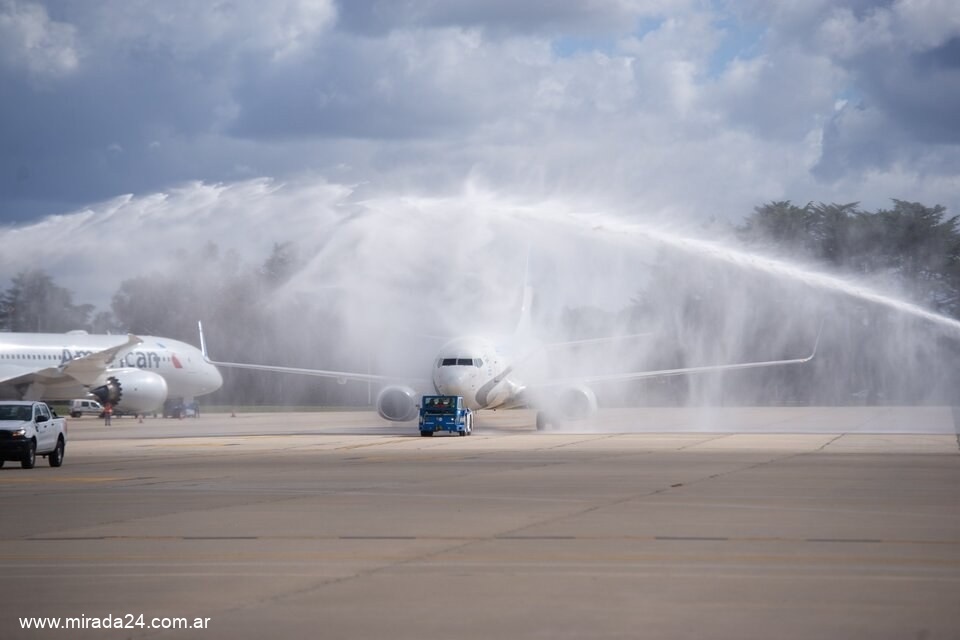 Aerolíneas Argentinas presentó este miércoles su primer avión exclusivo de carga. El evento se realizó en la terminal FBO del Aeropuerto Internacional de Ezeiza y, como es costumbre en la industria, la nave recibió su bautismo atravesando el arco de agua que las autobombas de ANAC forman cada vez que ingresa una nueva unidad.