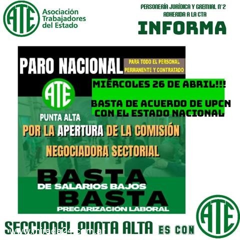 Desde la Asociación Trabajadores del Estado, Seccional Punta Alta, informan que según lo resuelto por el Consejo Directivo Nacional de ATE,la adhesion a la medida a nivel nacional es incondicional.