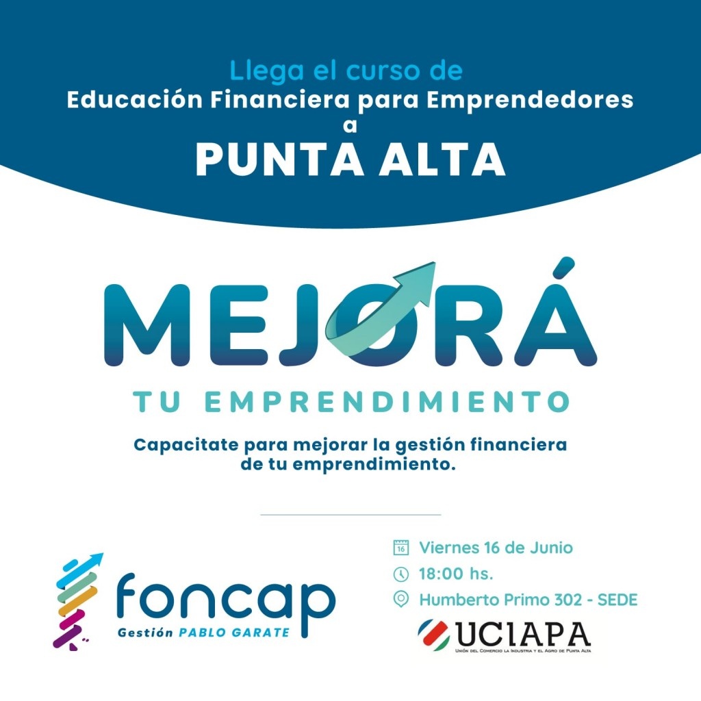 El Fondo Nacional de Capital Social invita a todos los vecinos y vecinas de Punta Alta a participar del Taller de capacitación “Mejorá tú emprendimiento” que estará brindando este viernes 16 de junio a las 18 hs. en Humberto 302, sede de UCIAPA.