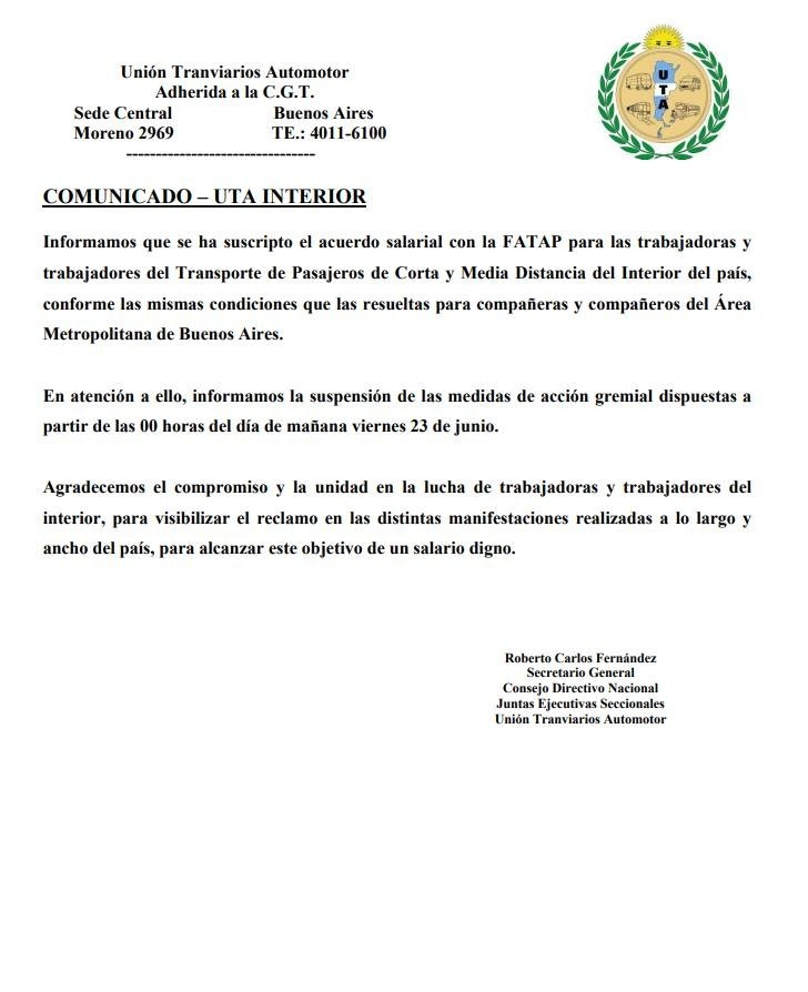Asi lo anuncio la UTA mediante comunicado oficial,el acuerdo se llevo a cabo con la FATAP y contempla a trabajadores de el transporte de corta y media Distancia.