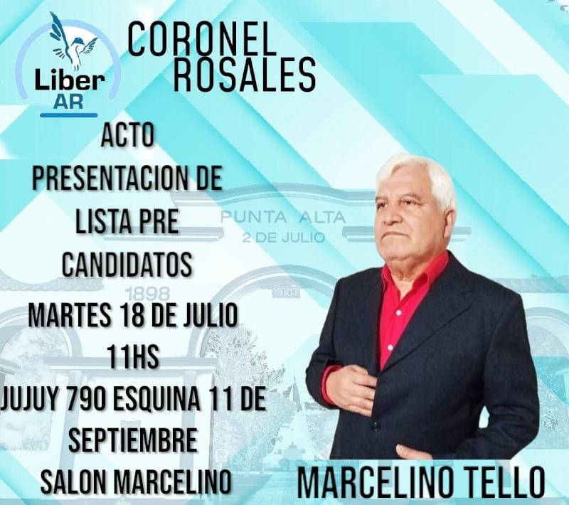 Convocamos a toda la prensa del distrito coronel rosales a asistir al acto presentación de lista pre - candidatos del partido Liber.AR el día martes 18 de julio a las 11hs, en el salón Marcelino.