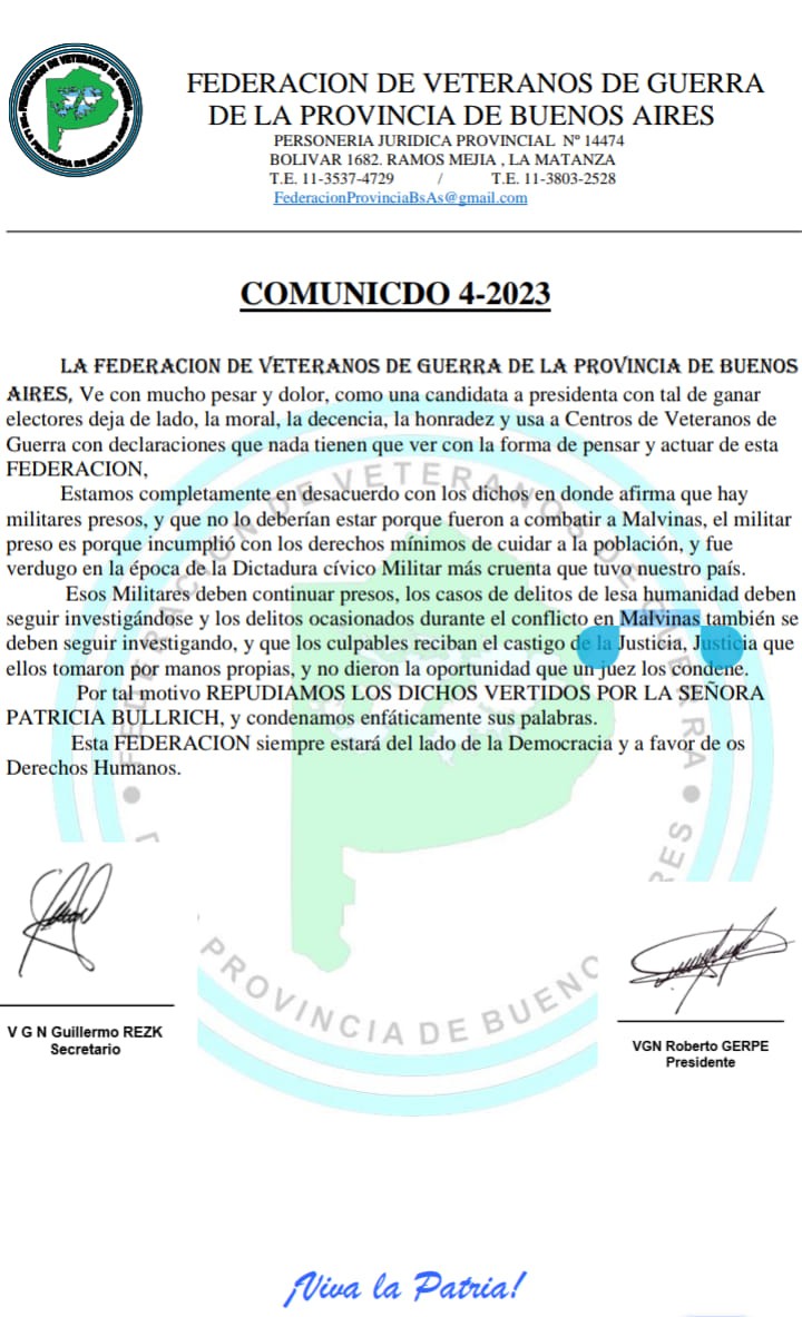 Fuerte Repudio de la Federacion de Veteranos de guerra por dichos de Patricia Bullrich
