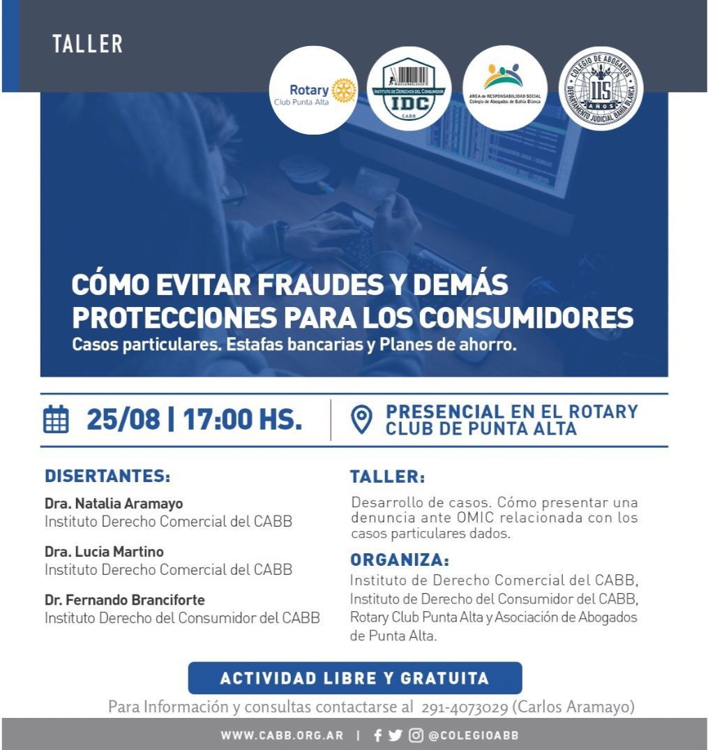 El Rotary club Punta Alta invita al taller capacitacion sobre como evitar defraudaciones bancarias y estafas en planes de ahorro,la jornada esta auspiciada por el Colegio de Abogados BB el dia 25 de agosto a las 17 hs.