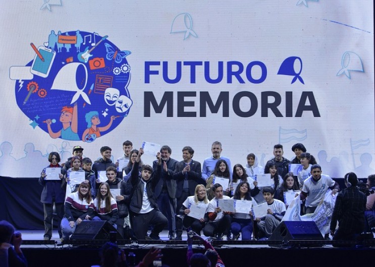 El gobernador Axel Kicillof encabezó este viernes el acto de entrega de certificados a jóvenes que participaron de la tercera edición del programa “Futuro Memoria”, una iniciativa que promueve la creación de producciones artísticas que visibilicen las luchas por la Memoria, la Verdad y la Justicia. Fue en el Microestadio de Tecnópolis junto a la referente de Madres de Plaza de Mayo Línea Fundadora, Taty Almeida y más de 3.500 chicos y chicas de diferentes puntos de la provincia. Estuvieron presentes también el director General de Cultura y Educación, Alberto Sileoni; los subsecretarios de Derechos Humanos, Matías Moreno; y de Industrias Creativas e Innovación Cultural, Cristian Scarpetta; y la directora provincial de Juventudes, Ayelén López.
