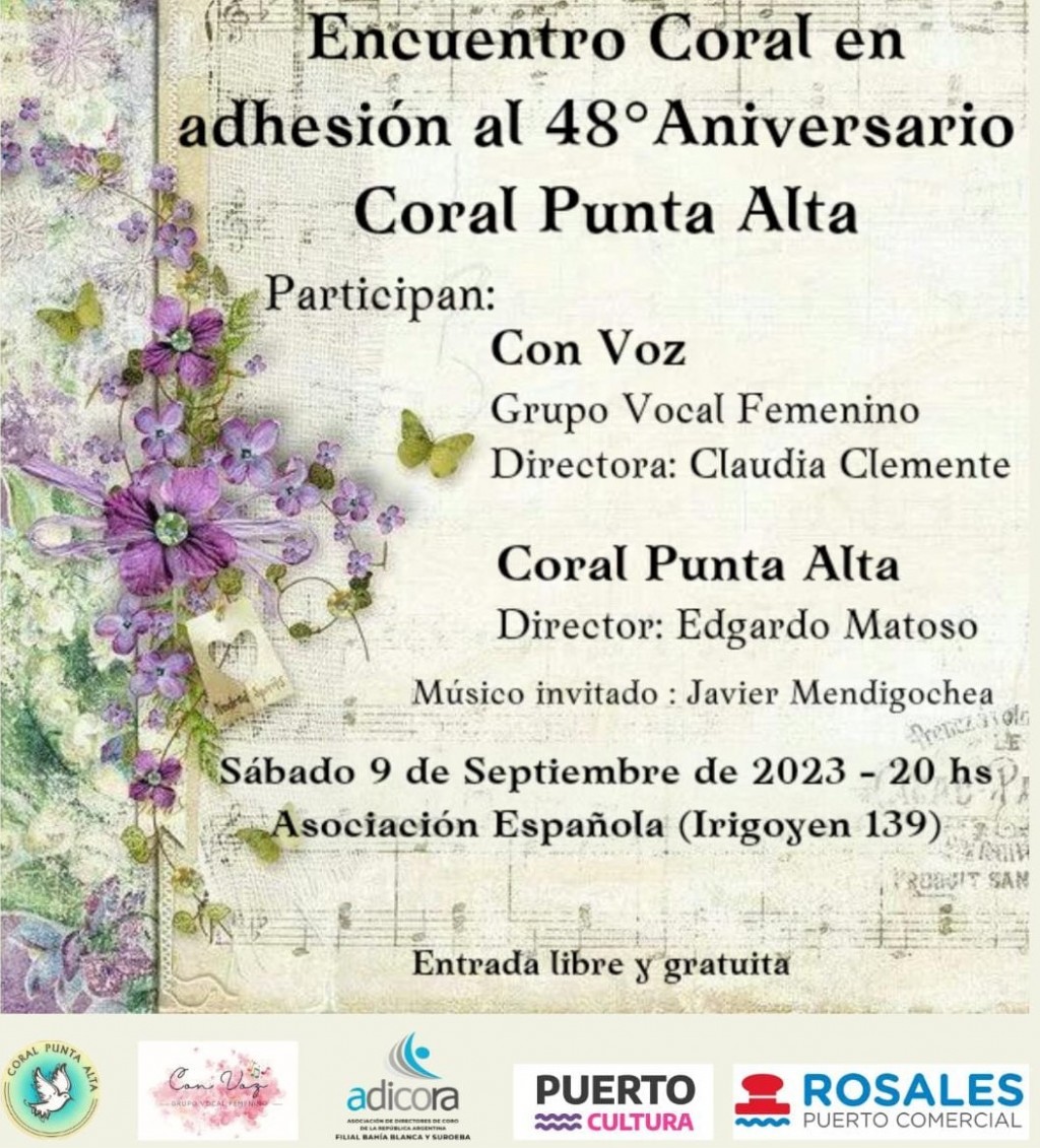 El próximo sábado 9 de Septiembre se llevará a cabo un Encuentro Coral para conmemorar el 48º Aniversario del Coral Punta Alta que dirige el maestro Edgardo Matoso, participarán, además, como invitados Con Voz, Grupo Coral Femenino ( de Bahía Blanca), que dirige la maestra Claudia Clemente, y el Bandoneonista Puntaltense Javier Mendigochea.