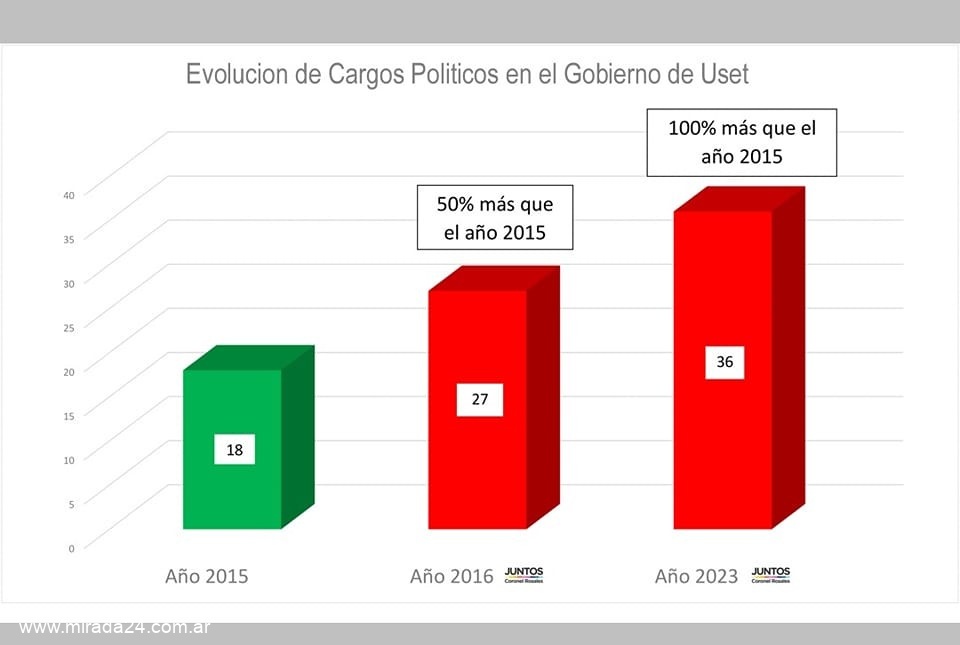 2015, al fin del Gobierno de la IVR existían solo 18 Cargos Políticos en el Ejecutivo; en menos de un año y a decretazo limpio del Pro Rosaleño pasamos a 27, y sobre el final de su Segundo Mandato la Gestión Uset duplica el número inicial. Por este derroche, #BienComún votó contra el aumento de tasas del 70% aprobado por Juntos. La pregunta para que analices es simple: ¿Mejoraron los servicios que recibís en estos años con tantos cargos o solo tenemos más gasto alejado de tus prioridades?   Fuente: Bloque Bien Comun