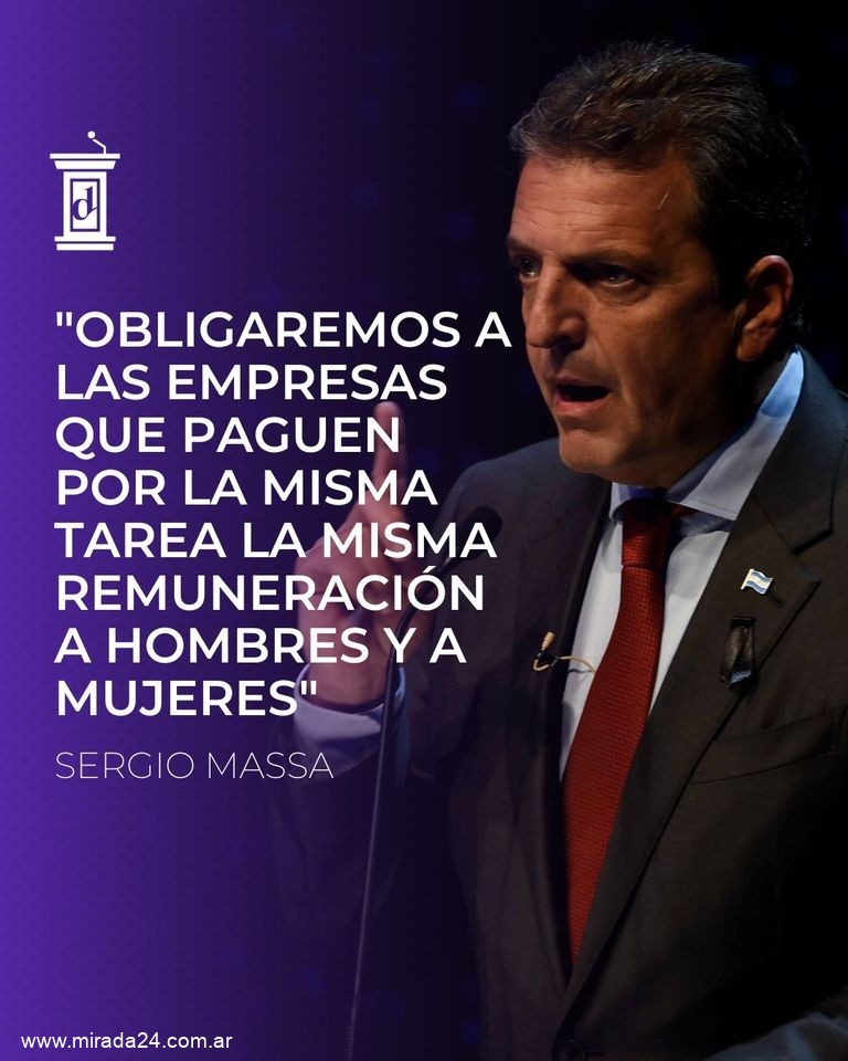 El ministro de Economía y candidato a presidente de Unión por la Patria prometió que impulsará medidas para garantizar la igualdad de ingresos entre hombres y mujeres en todas las empresas del país.Además expresó que su política estará guiada por dos ejes asociados a la "paritaria libre y la reducción de impuestos".Aqui parte de la exposicion