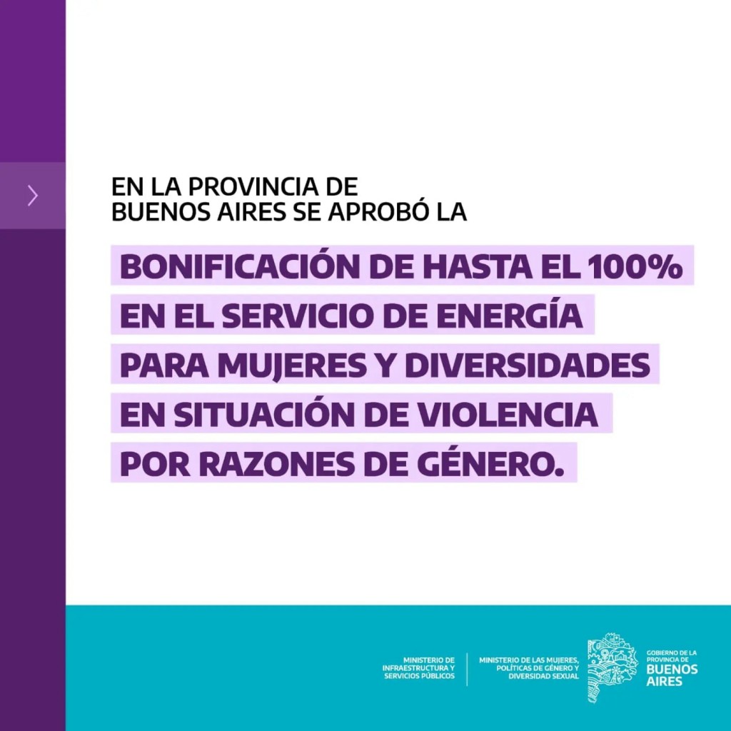 Por iniciativa conjunta del Ministerio de las Mujeres, Políticas de Género y Diversidad Sexual y la Subsecretaría de Energía del Ministerio de Infraestructura y Servicios Públicos, el gobierno provincial estableció la posibilidad de acceder a una bonificación de hasta el 100% sobre la facturación del servicio público de energía eléctrica a mujeres y LGTBI+ en situación de violencia por razones de género que habitan en el territorio de la provincia de Buenos Aires.