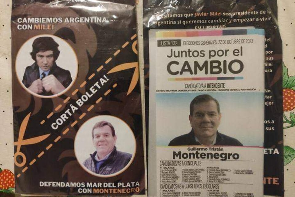 En paralelo comenzaron a circular imágenes que muestran paquetes armados de boletas de Milei con el corte para la categoría de intendente, donde aparece la de Montenegro con el sello de Juntos por el Cambio. "Cambiemos Argentina con Milei, defendamos Mar del Plata con Montenegro", dicen los volantes que acompañan las boletas del libertario y el intendente bonaerense.