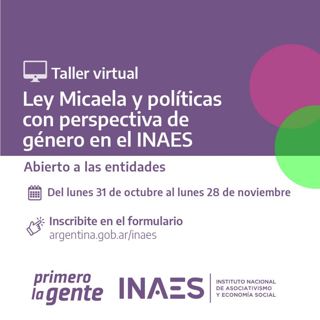 Se encuentra abierta la inscripción para el taller virtual: "Ley Micaela y Políticas con perspectiva de género en el INAES y la ESS". La instancia de formación ha sido diseñada por la Unidad de Géneros y Diversidad de INAES en cumplimiento a la Ley 27.499 y situada en la economía popular, social, solidaria y transfeminista, es decir que cuenta con una diagramación específica que incluye conceptos y experiencias referidos a la ESS.