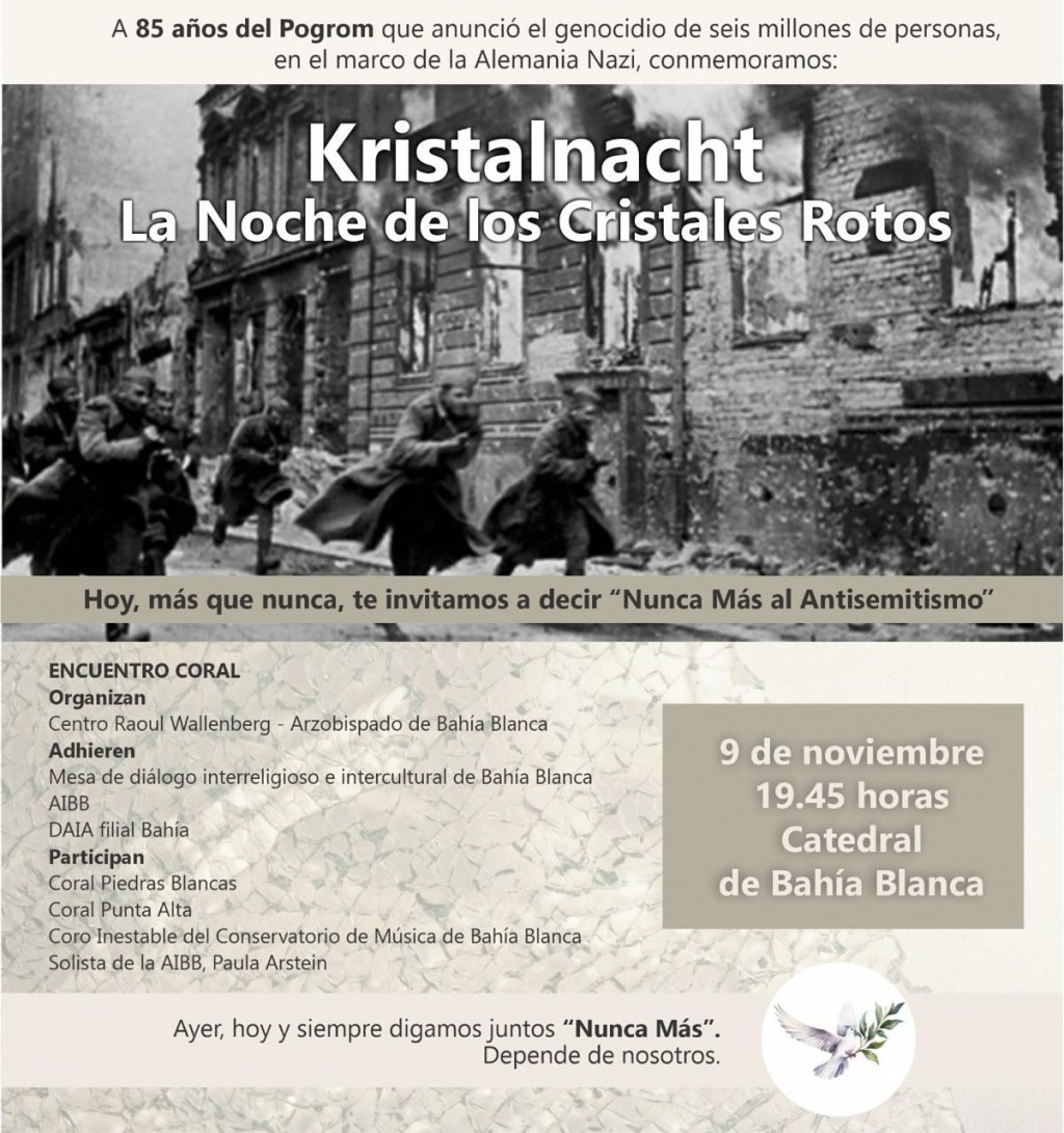 El Centro Raoull Wallenberg y el Arzobispado de Bahía Blanca invitan a toda la población al encuentro coral con el objetivo del Acto en Recordación y Conmemoración de la Kristallnacht. La noche de los Cristales rotos de 1938