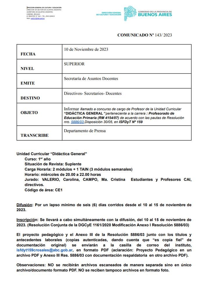 Informa llamado a concurso de cargo de Profesor de la UnidadCurricular “DIDÁCTICAGENERAL”perteneciente a la carrera:Profesorado de Educación Primaria(RM4154/07)de acuerdo con las pautas de Resolución nro.5886/03Disposición30/05,en ISFDyTNº159