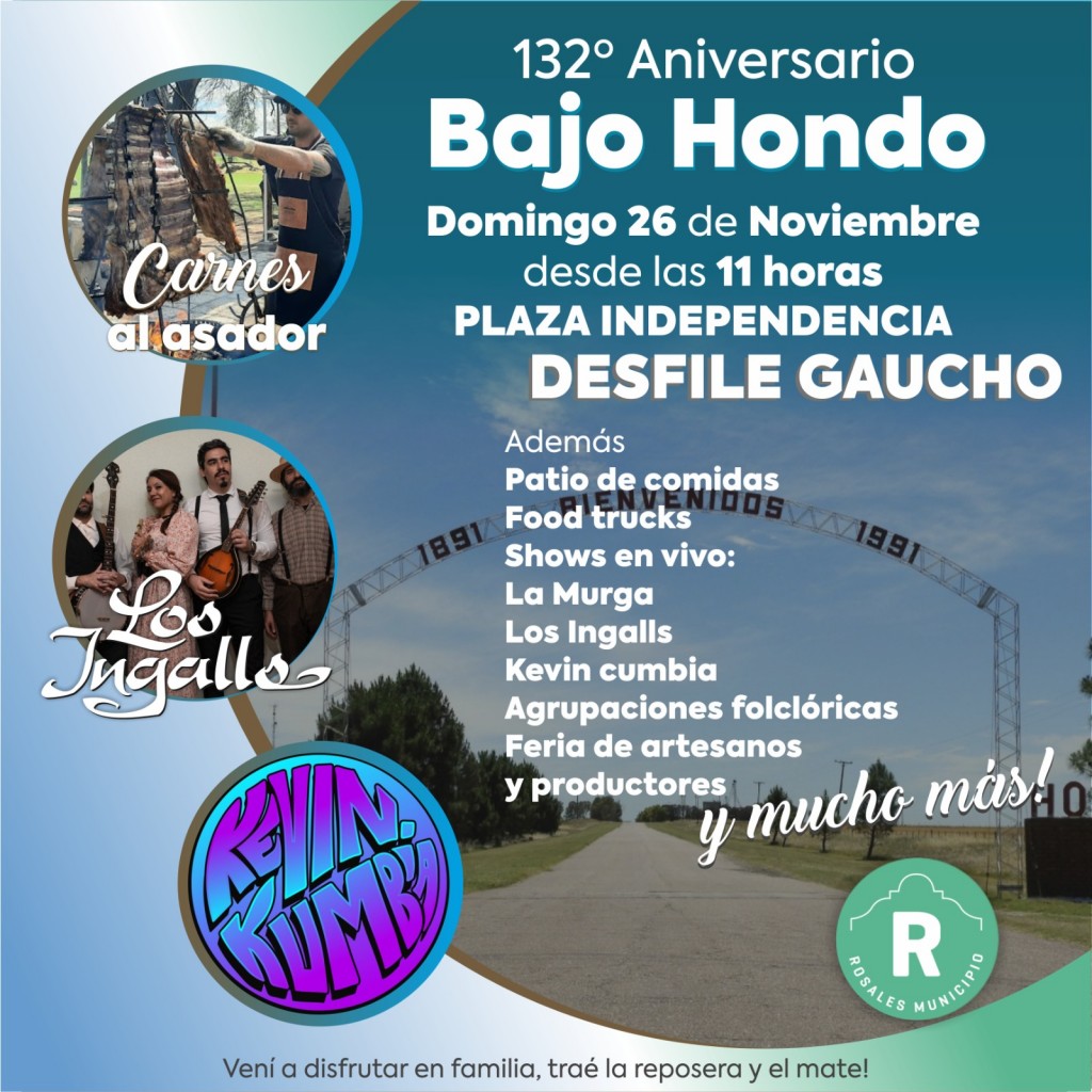 La fiesta por el 132° aniversario de Bajo Hondo tendrá lugar el domingo 26 de noviembre, organizada desde Rosales Municipio en conjunto con la comisión conformada recientemente por diferentes instituciones y vecinos de la localidad. Desde las 11hs, habrá un importante patio gastronómico con comidas al disco y al asador, así como espectáculos musicales, desfile gaucho y stands de artesanos y emprendedores