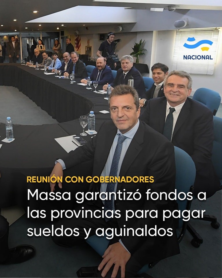 El ministro de Economía, Sergio Massa, mantuvo un encuentro con gobernadores para avanzar en la puesta en marcha de compensaciones que garanticen el pago de sueldos y aguinaldos para el mes de diciembre en los distritos.