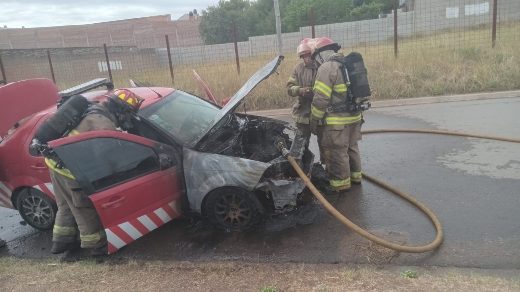 Un momento de dramatismo se vivio en la calle quintana al 1100 entre la avenida Jujuy y la calle rodriguez Peña cuando en horas de la mañana un vehiculo que transitaba la calle y de repente exploto tomando fuego inmediatamnete, al aviso de los bomberos voluntarios llega un movil acompañado de policia comunal que corta el acceso a la arteria donde se estaba manifestando el siniestro y proceden a controlar el mismo.