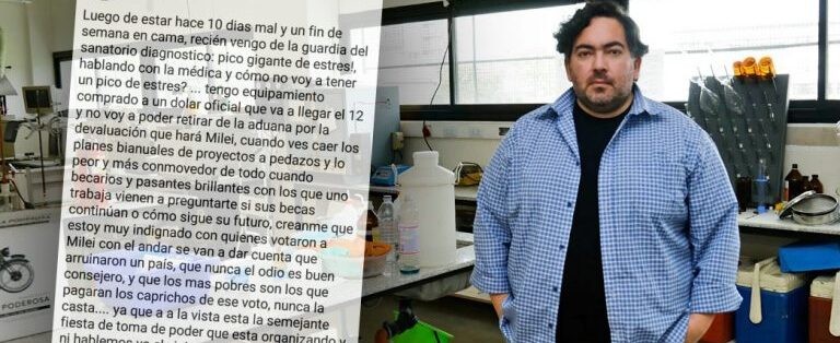 “Luego de estar hace 10 días mal y un fin de semana en cama, recién vengo de la guardia del sanatorio”, señaló en ese posteo. Y agregó que el diagnostico fue un “pico gigante de estres”. Sobre eso, explicaba: “¿Y cómo no voy a tener un pico de estres? Tengo equipamiento comprado a un dolar oficial que va a llegar el 12 (de diciembre) y no voy a poder retirar de la aduana por la devaluación que hará (el próximo presidente, Javier) Milei. Cuando ves caer los planes bianuales de proyectos a pedazos y lo peor y más conmovedor de todo, cuando becarios y pasantes brillantes con los que uno trabaja vienen a preguntarte si sus becas continúan o cómo sigue su futuro”.