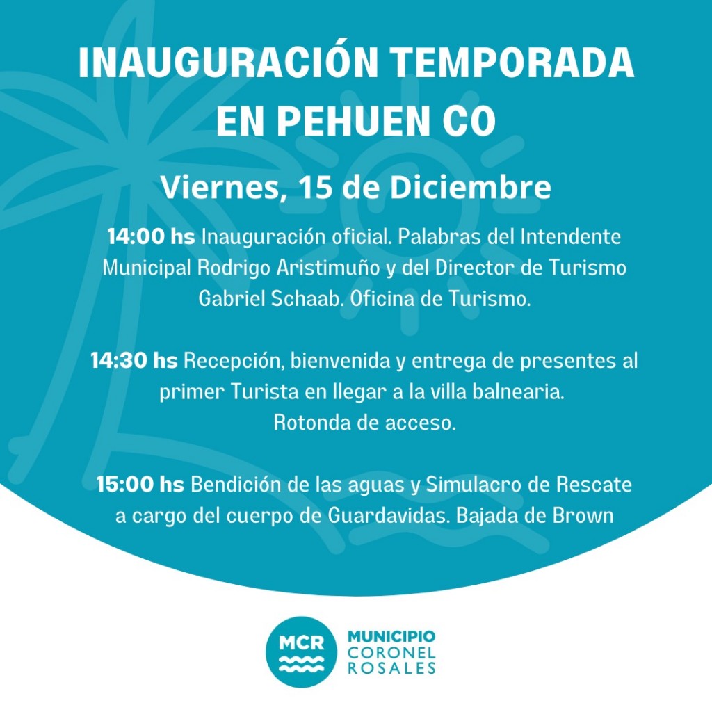 La municipalidad de coronel rosales dio a conocer el día en que oficialmente se abre la temporada en Pehuenco, el anuncio es a partir de la comunicación establecida por el equipo de prensa del municipio.