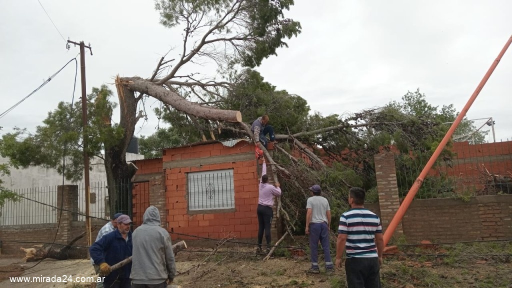 Los trabajos de corte y achicamiento en árboles y postes que cayeron sobre los techos de las casas están siendo removidos constantemente por personal municipal, la delegación ,colaboradores del movimiento evita y vecinos con el objetivo de liberar los cables para que cooperativa eléctrica reinstale el servicio, de a poco y con mucho trabajo se normaliza la situación.