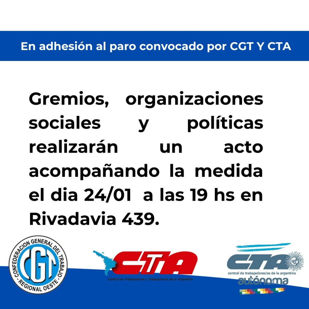 La central obrera local y la Central de trabajadores autonomos adhieren y llama a ser parte de la jornada de paro y movilizacion en contra del Decreto y ley Omnibus impuestas por el gonierno del presidente Milei.