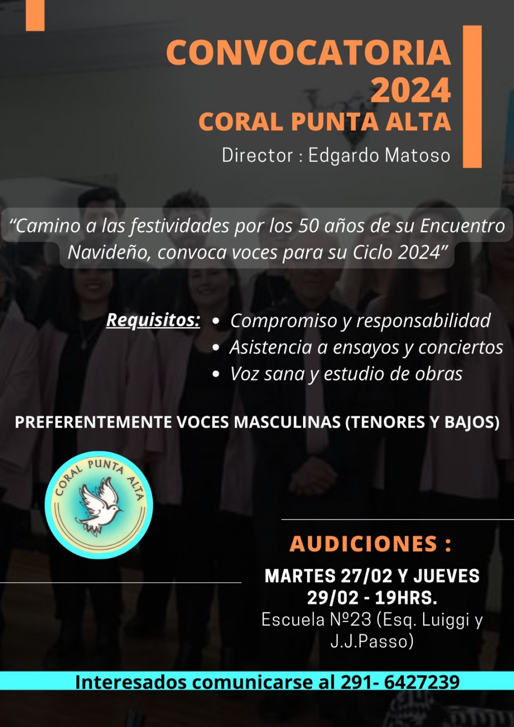 El Coral Punta Alta tiene abierta la inscripción para la incorporación de nuevos integrantes, principalmente voces masculinas (Tenores y Bajos), que deseen incorporarse a la agrupación, comenzando a transitar el año del 50° Aniversario de su Tradicional Encuentro Coral Navideño.