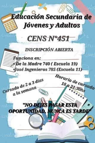 El CENS Nº451 informa a todos los interesados que se encuentra abierta la inscripción para finalizar los estudios secundarios para jóvenes y adultos, a partir de los 18 años de edad.