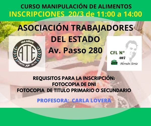 A cargo de la profesora Carla Lovera se dictará, de forma gratuita, el curso “Manipulación de Alimentos”, a partir del 16 de abril.