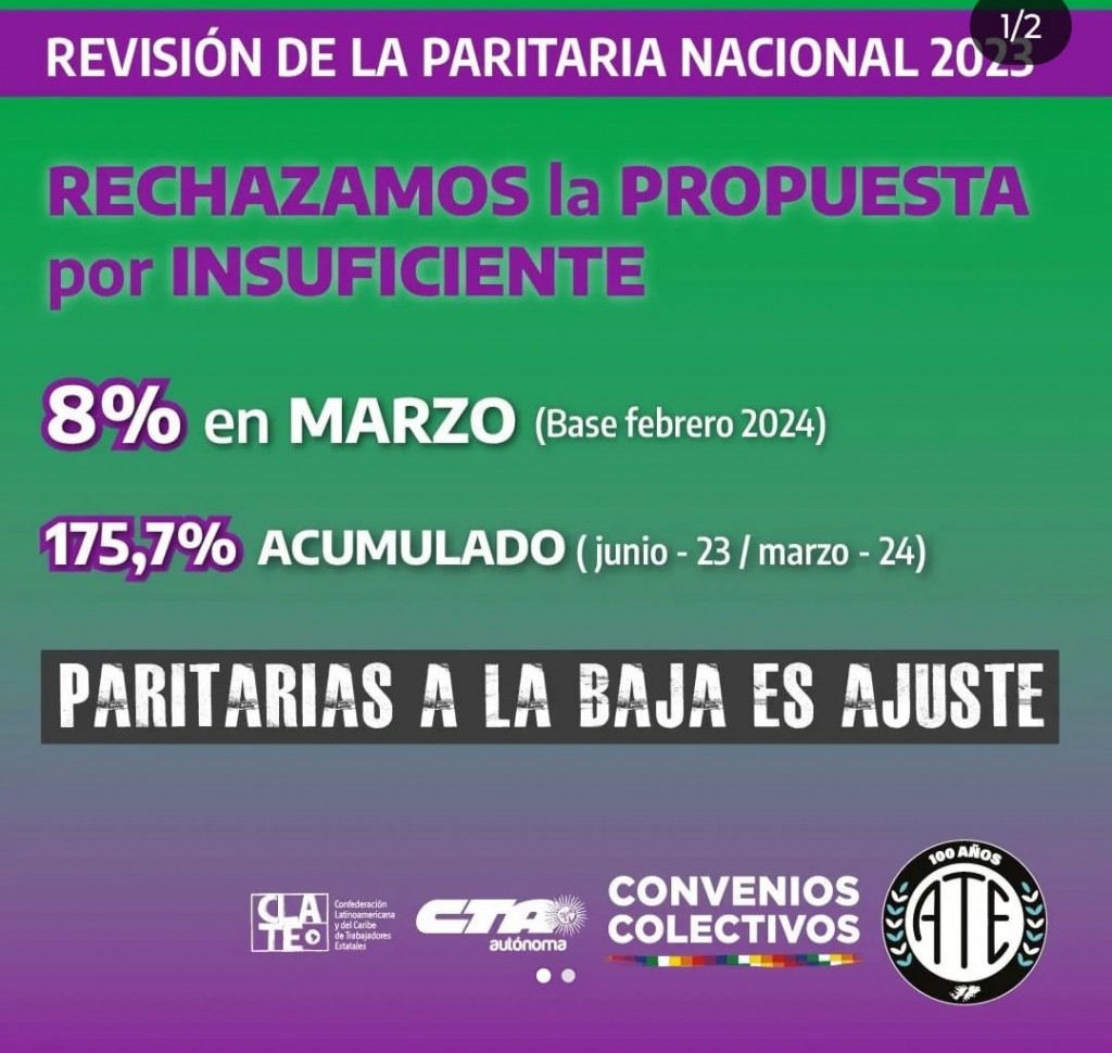 Por su parte, la Secretaria Adjunta de ATE Nacional, Mercedes Cabezas, manifestó: “Rechazamos la Paritaria no solamente porque consideramos que es insuficiente un 8 por ciento en el contexto inflacionario que vivimos –basta con mirar los índices de precios al consumidor y uno se da cuenta de que la canasta básica alimentaria ha subido de manera exponencial y que los sueldos de las y los trabajadores no-, sino también porque seguimos sintiendo un gran atentado contra el Estado en función de los despidos masivos que sabemos que van a recibir los trabajadores y las trabajadoras al 31 de marzo, y porque persisten las declaraciones orientadas a la privatización de espacios públicos y a la destrucción del Estado en general”.
