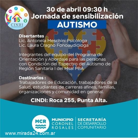 Para quienes trabajamos, acompañamos o compartimos nuestras vidas con una persona con Condición del Espectro del Autismo (CEA), el mes de abril ocupa un lugar importante en nuestra agenda ya que desde la Asamblea General de las Naciones Unidas se instauró el 2 de abril como el Día de la concientización sobre el Autismo. Nuestra labor es visibilizar los derechos de las personas con CEA y particularmente propiciar acciones que promuevan la detección temprana de dicha condición. Por ello es necesario que se conozcan cuáles son los signos de alerta, indicadores de alarmas, detección precoz ya que esto incide favorablemente en su pronóstico. Desde la Secretaría de Desarrollo Comunitario consideramos la necesidad de impulsar acciones que garanticen el derecho a la participación sin discriminación en toda la vida de la sociedad de niños, niñas y adolescentes. En este marco, convocamos a las profesionales de PROACEA de Región Sanitaria I, a participar en esta jornada de sensibilización que se realizará en las instalaciones de Cindi, el próximo 30 de abril a las 9.30 hs, Roca 255, Punta Alta. Organiza: Municipio Coronel Rosales