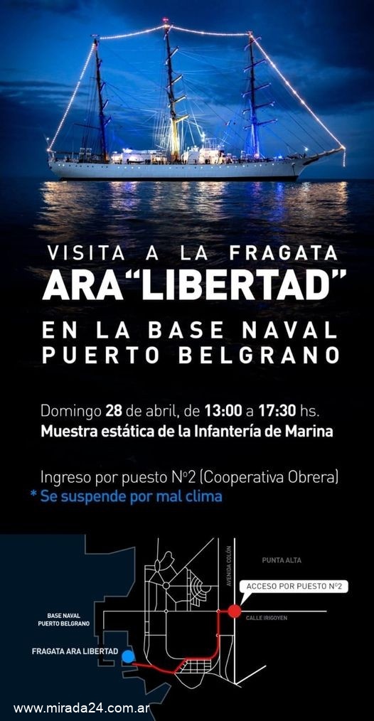 El Comando de Adiestramiento y Alistamiento de la Armada informa que la Fragata ARA “Libertad” abrirá sus puertas el domingo 28 de abril de 13:00 a 17:30 hs, invita a la comunidad a visitarla de manera libre y gratuita.