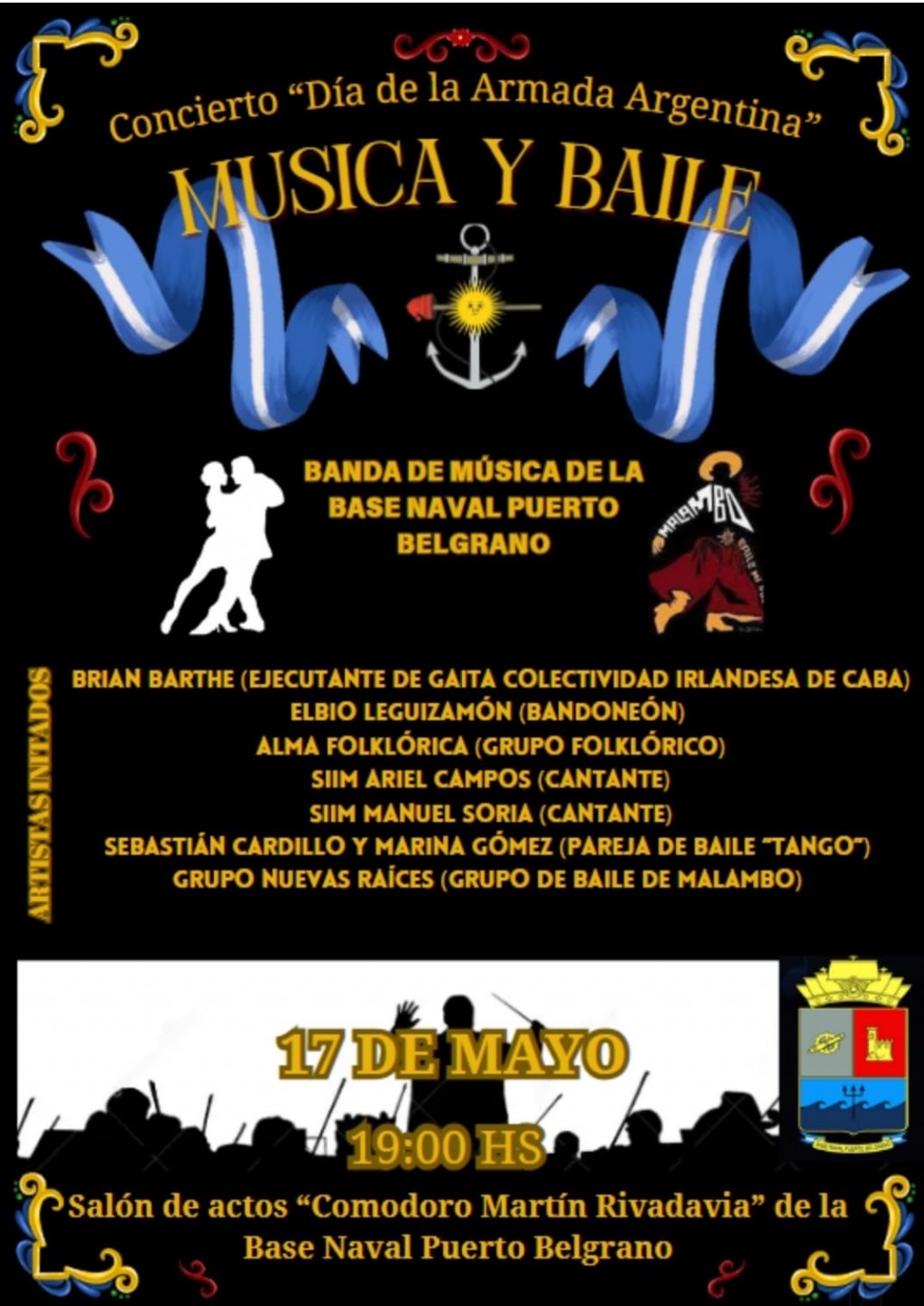 El viernes 17 de mayo a las 19:00 hs., en el marco de los festejos por un nuevo aniversario de la creación de la Armada Argentina, se llevará a cabo en el Cine “Comodoro Rivadavia” de la Base Naval Puerto Belgrano, el tradicional concierto donde se presentará la Banda de Música de la Base Naval Puerto Belgrano, junto a Brian Barthe (ejecutante de Gaita de la comunidad Irlandesa); Elbio Leguizamón en bandoneón; el grupo Alma Folclórica; la pareja de tango integrada por Sebastián Cardillo y Marina Gómez; el grupo de baile de Malambo “Nuevas Raíces”; y las voces de los suboficiales Ariel Campos y Manuel Soria.