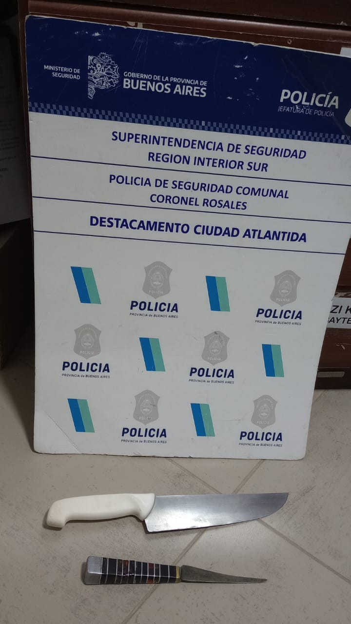 Fecha 11/06/24 00:50 hs a raìz de llamado al 911 personal policial destacamento ciudad Atlántida procede en calle Libertad y Jose Ingenieros a la Aprehensión de masculino (17) y a la aprehensiòn de JOAQUIN SARMIENTO (20) , quienes minutos antes arrojan piedras dañando la ventana de una propiedad ubicada en ALB V. Que con anterioridad ante la presencia del personal policial descartan dos cuchillos en la vìa pùblica. Interviene FRPJ Nro 1, UFIJ Nº 15 DJBB y Juzgado de Paz Cnel Rosales. Actuaciones