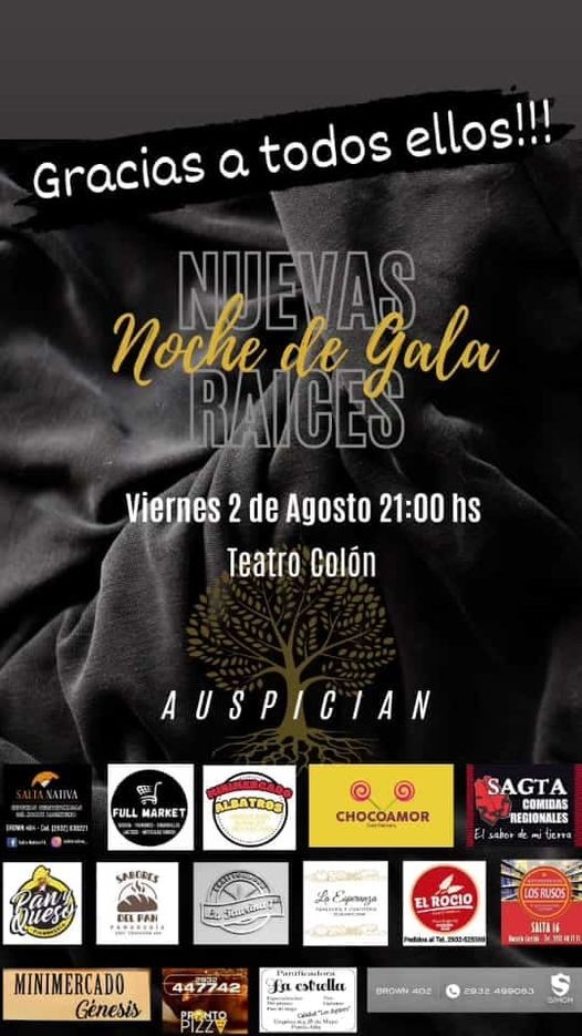 La agrupación folclórica Nuevas Raíces tendrá su noche de Gala en el Teatro Colon a partir de las 21 hs del 2 de Agosto próximo. Grupos y artistas locales y la region serán parte de esta fiesta tradicionalista.