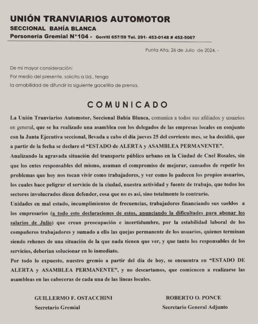 La Unión Tranviaria Automotor seccional Bahía Blanca anuncia que debido a desacuerdos con las empresas locales que anuncian la dificultad de abonar los salarios próximos sumados a las deficientes unidades e incumplimientos en las frecuencias es que se toma la decisión de declarase en Estado de Alerta y Asamblea Permanente.