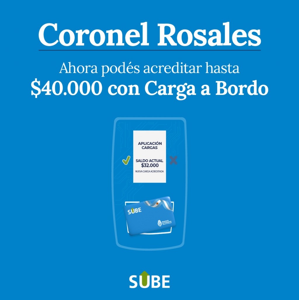 La funcionalidad Carga a Bordo permite acreditar las cargas compradas de manera electrónica en la tarjeta SUBE en las validadoras de los colectivos, ya comenzó a funcionar en la ciudad de Coronel Rosales. Una alternativa para acreditar las cargas realizadas a través de homebanking, cajeros automáticos y billeteras virtuales de hasta $40.000