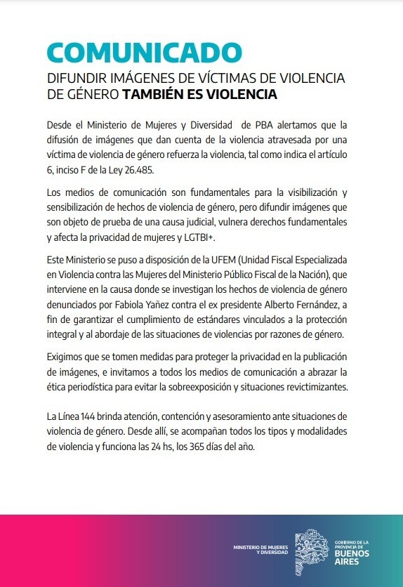 Comunicado desde el Ministerio de Mujeres y Género de la Provincia de Buenos Aires