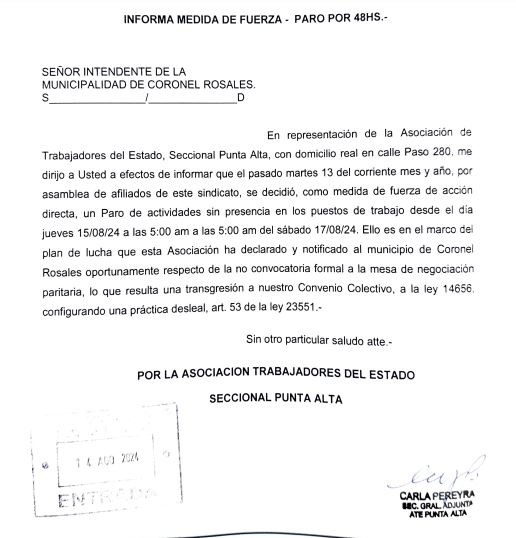 La medida surge como consecuencia a la poca respuesta que el ejecutivo municipal presta a esta gremial a los pedidos de convocatoria para discutir diferentes problemática de trabajadores.En tal sentido esta Asociación ha declarado y notificado al municipio de Coronel Rosales oportunamente respecto de la no convocatoria formal a la mesa de negociación paritaria, lo que resulta una transgresión a nuestro Convenio Colectivo, a la ley 14656, configurando una práctica desleal, art. 53 de la ley 23551.