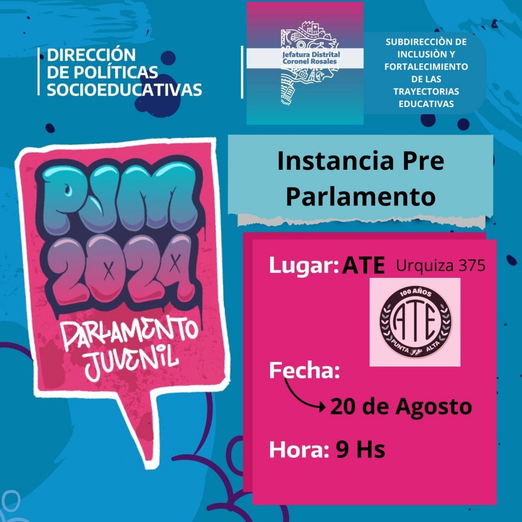 ATE Punta Alta se enorgullece de ser la sede de la instancia Pre Parlamento Juvenil 2024, un evento que reunirá a jóvenes de diversas escuelas secundarias y de la modalidad adulto del distrito de Coronel Rosales. La jornada se llevará a cabo el próximo 20 de agosto, en el Salón de Usos Múltiples (SUM) de la sede de ATE, ubicada en Urquiza 375, de 9 a 13 horas.