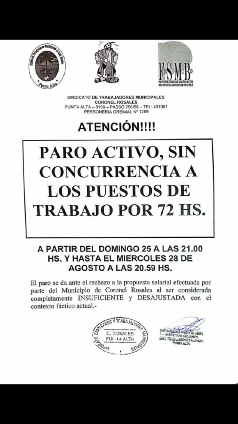 Por intermedio del secretario adjunto Víctor Sarmiento, se le notificó al intendente Rodrigo Aristimuño la convocatoria a un “paro sin concurrencia al puesto de trabajo y movilización” por el plazo de 72 horas desde el domingo a las 21hs. hasta las 20.59hs. del miércoles.