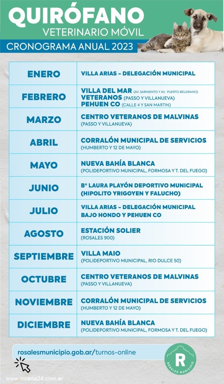 Cabe destacar que el servicio de castración de perros y gatos es gratuito, dependiente de la secretaría de Salud, que atiende de lunes a viernes en horas de la mañana, y de 15 a 18hs, los días martes, miércoles y jueves. Los turnos para la atención, tanto durante la mañana como la tarde, continuarán entregándose a través de la página web del Municipio en www.rosalesmunicipio.gob.ar La entrega de turnos se habilita en forma mensual, el último día viernes de cada mes, entregando turnos para el mes entrante. Cronograma 2023 ENERO: VILLA ARIAS (DELEGACIÓN MUNICIPAL) FEBRERO: VILLA DEL MAR (AV SARMIENTO Y AV. PUERTO BELGRANO), CENTRO DE VETERANOS de MALVINAS (PASO Y VILLANUEVA), y PEHUEN CO (CALLE 4 Y SAN MARTIN) MARZO: CENTRO VETERANOS DE MALVINAS (PASO Y VILLANUEVA) ABRIL: CORRALÓN MUNICIPAL DE SERVICIOS (HUMBERTO Y 12 DE MAYO) MAYO: NUEVA BAHÍA BLANCA (POLIDEPORTIVO MUNICIPAL, FORMOSA Y T. DEL FUEGO) JUNIO: B° LAURA PLAYÓN DEPORTIVO MUNICIPAL (HIPÓLITO YRIGOYEN Y FALUCHO) JULIO: VILLA ARIAS (DELEGACIÓN MUNICIPAL), BAJO HONDO Y PEHUEN CO AGOSTO: ESTACIÓN SOLIER (ROSALES 900) SEPTIEMBRE: VILLA MAIO (POLIDEPORTIVO MUNICIPAL, RIO DULCE 50) OCTUBRE: CENTRO VETERANOS DE MALVINAS (PASO Y VILLANUEVA) NOVIEMBRE: CORRALÓN MUNICIPAL DE SERVICIOS (HUMBERTO Y 12 DE MAYO) DICIEMBRE: NUEVA BAHÍA BLANCA (POLIDEPORTIVO MUNICIPAL, FORMOSA YT. DEL FUEGO)