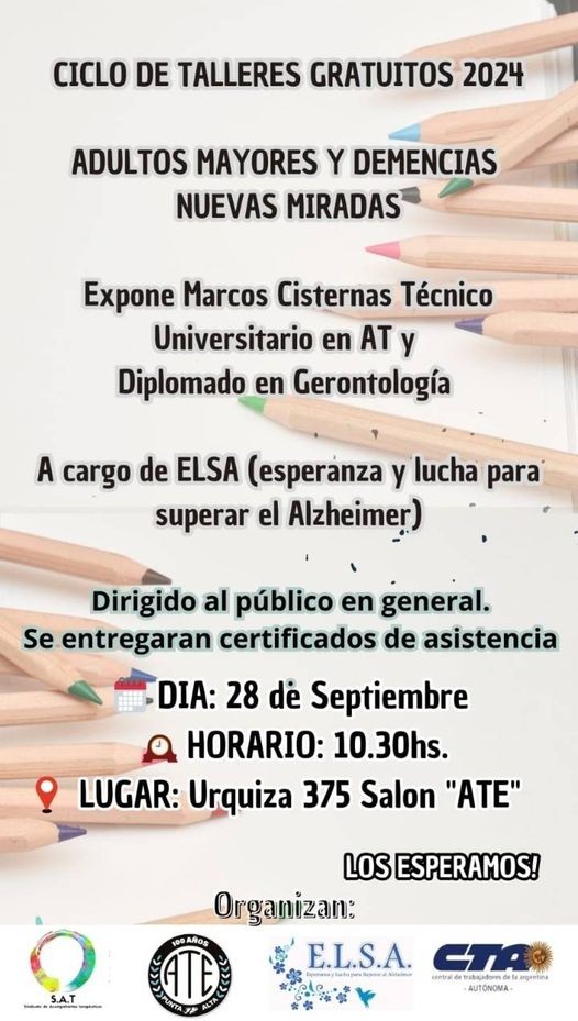 ATE Punta Alta invita a toda la comunidad Rosaleña a participar del Taller gratuito sobre Adultos Mayores y Demencias, el cual será impartido por Marcos Cisternas, Diplomado en Gerontología
