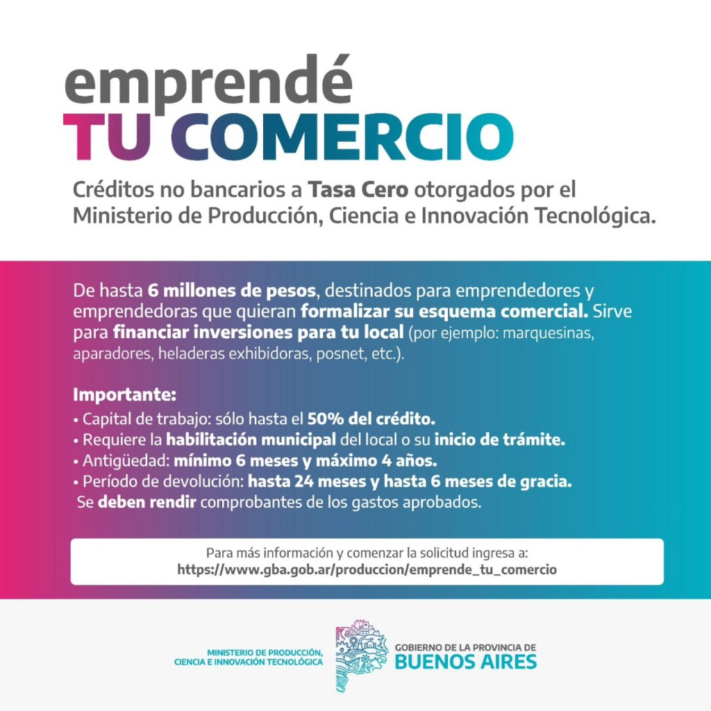 Créditos no bancarios a Tasa Cero otorgados por el Ministerio de Producción, Ciencia e Innovación Tecnológica de la provincia de Buenos Aires. De hasta 6 millones de pesos, destinados para emprendedores y emprendedoras que quieran formalizar su esquema comercial. Sirve para financiar inversiones para tu local (por ejemplo: marquesinas, aparadores, heladeras exhibidoras, posnet, etc.).
